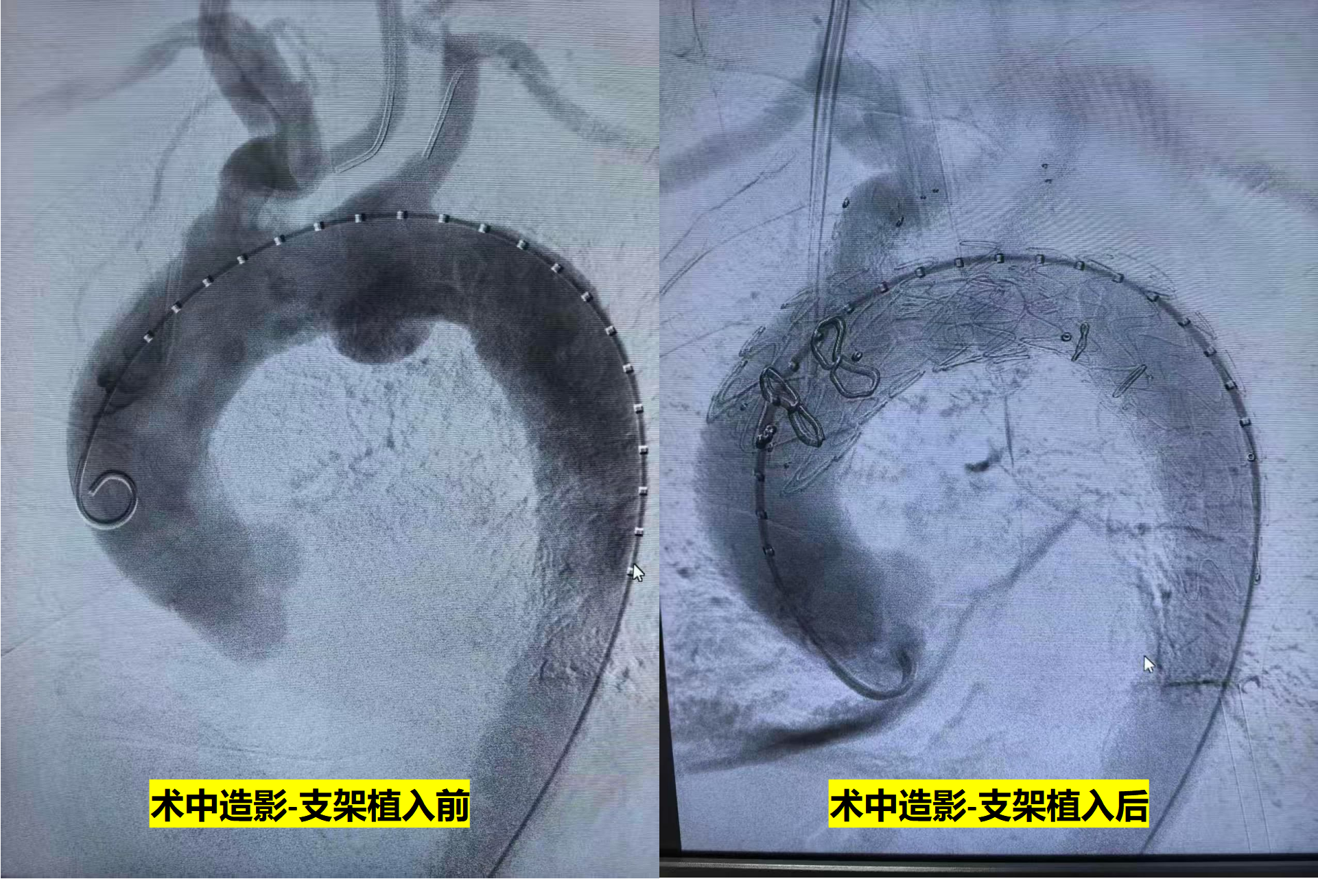 专家们通过老人大腿根部、手臂和脖子上的几个“小口子”建立通道,把一款特制的覆膜支架系统精准送到病变部位。支架展开后,相当于在血管内部搭建了一条“人工血管”,让血液改走新通道,不再冲击动脉瘤,从根源上消除了破裂风险。“简单说,就是从血管里面把‘炸弹’包起来。”舒畅教授打了个比方。这项新技术,不用开胸、不使心脏停跳,整个手术对心肺的干扰降到了最低。