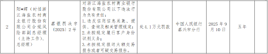 阳*辉(时任浙江海盐农村商业银行股份有限公司合规风险部副总经理(主持工作)、总经理)对该行“违反信用信息采集、提供、查询及相关管理规定;未按规定履行客户身份识别义务;未按规定报送大额交易报告或者可疑交易报告”的违法行为负有责任,被处4.1万元罚款。