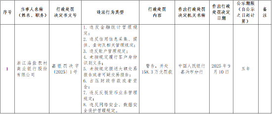 9月19日金融一线消息浩广配资,中国人民银行嘉兴市分行行政处罚决定信息公示表显示,浙江海盐农村商业银行因违反金融统计管理规定;违反信用信息采集、提供、查询及相关管理规定;违反账户管理规定;未按规定履行客户身份识别义务;未按规定报送大额交易报告或者可疑交易报告;占压财政存款或者资金;违反反假货币业务管理规定;违反网络安全、数据安全保护管理规定,被中国人民银行嘉兴市分行警告,并处158.3万元罚款。